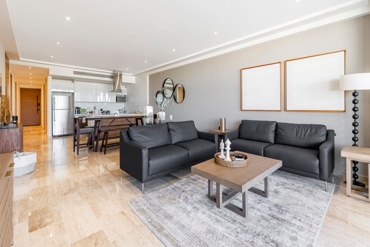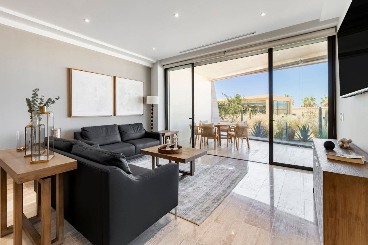 Mistiq is a new modern luxury complex where you can enjoy cabo to its fullest. Large 3 BD condo, fully equipped, common areas with pools, bbq grill, gym and TV room. This 3-bedroom condo in Mistiq Cabo features spacious and elegantly designed interiors, with large windows that maximize natural light and provide breathtaking views of the ocean or surrounding landscapes. Enjoy and relax in exterior common area pool and hot tub. Indoor gym, exterior BBQ and common area lounge and TV room. - Bedroom 1: King, En Suite Bath, Terrace Access, A/C - Bedroom 2: Queen Bed, En Suite bath, A/C - Bedroom 3: Two double beds, En Suite Bath, A/C - Kitchen/Living Room: Full kitchen, dining room (8 ppl), Terrace Access - Exterior Lunch Table, Exterior Seating Area Exterior Ammenities: - Common area infinity pool with ocean views and sundeck - Common area exterior grill and seating to enjoy any meal during the day - Indoor Gym - Five-minute drive to downtown Cabo San Lucas Guests can access all areas within the condo and in the common areas Our team of hospitality specialists is available through the Airbnb platform or provided contact numbers.